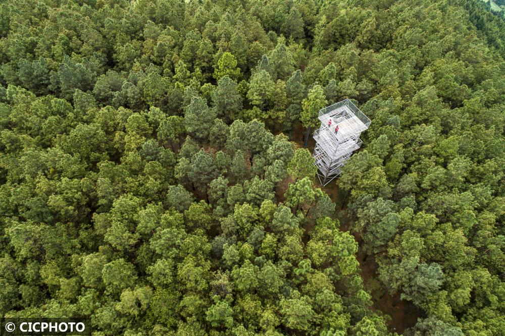 ↑2022年3月23日,四川省阆中市桥楼乡老牛山林区护林员在瞭望塔上瞭望林场。(无人机照片)CICPHOTO/王玉贵 摄