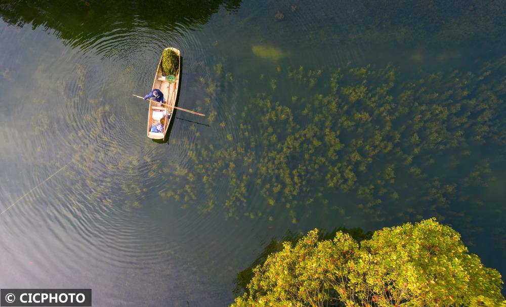 ↑2022年3月29日,河道保洁员在浙江省湖州市德清县洛舍镇东衡村庙前兜水域打捞水面漂浮物。(无人机照片)CICPHOTO/谢尚国 摄