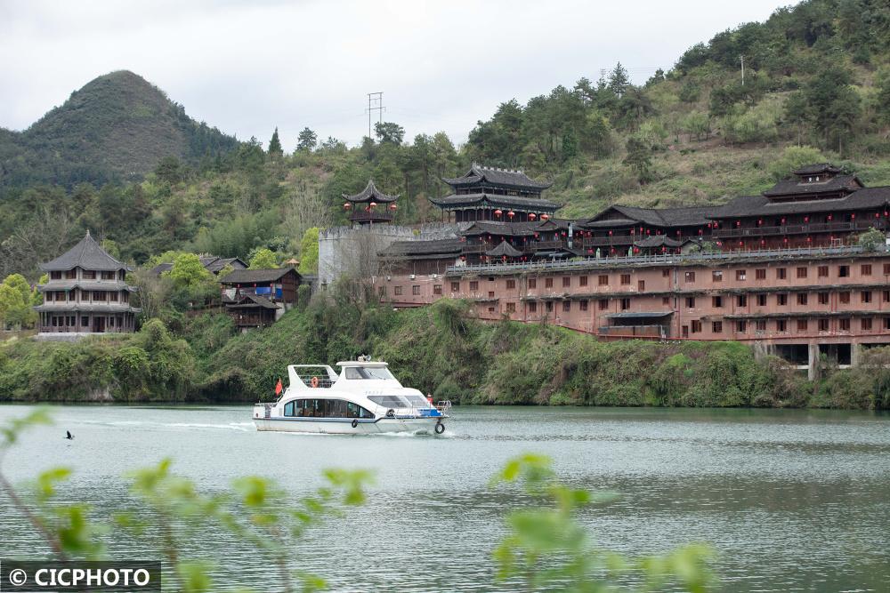 ↑2022年3月22日,水上公交船航行在贵州省铜仁市锦江河上。CICPHOTO/叶顺强 摄