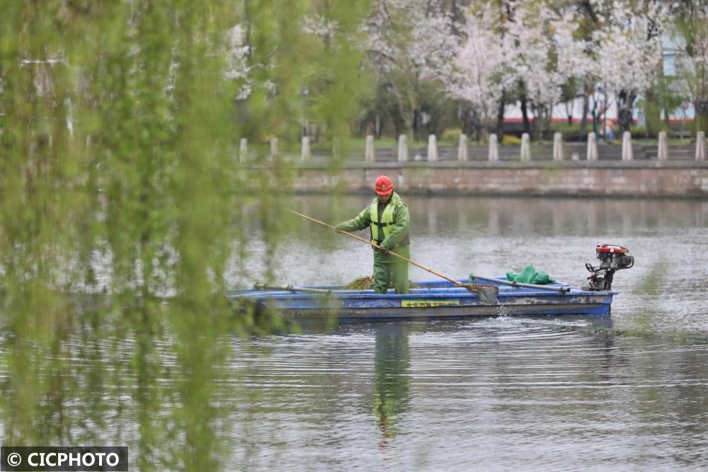 ↑2022年3月22日,环卫工人在浙江省嘉兴市南湖湖面上打捞漂浮物。CICPHOTO/金鹏 摄