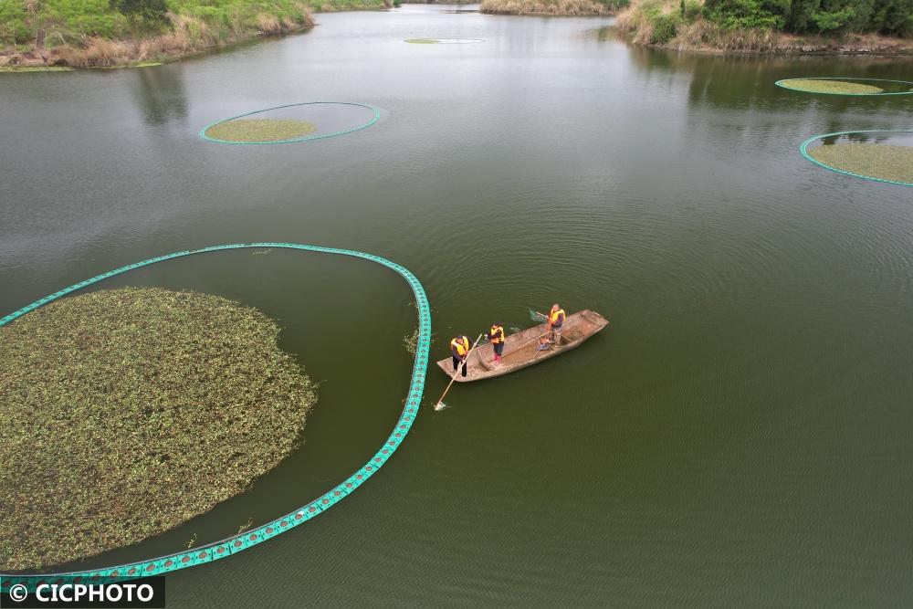↑2022年3月22日,工作人员在四川省内江市东兴区双桥镇马锣山水库清理水面漂浮物。(无人机照片)CICPHOTO/唐明润 摄