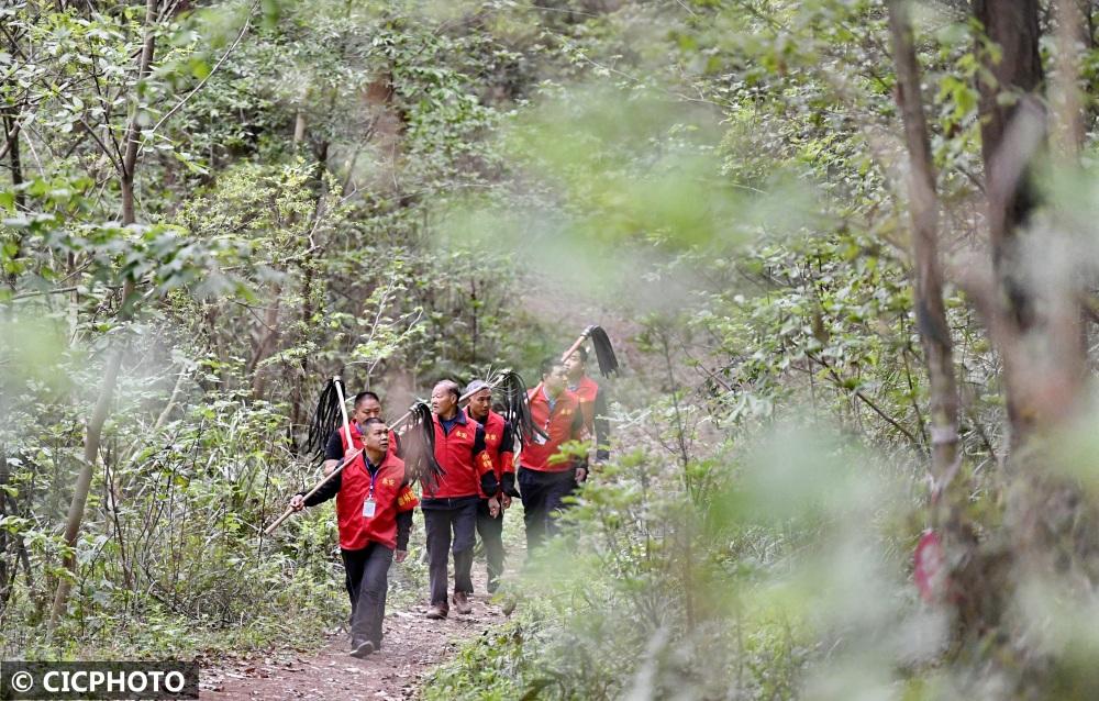 ↑2022年3月21日,四川省成都市双流区永安镇付家坝社区森林防火队员在辖区森林里进行防火安全巡查。CICPHOTO/李向雨 摄