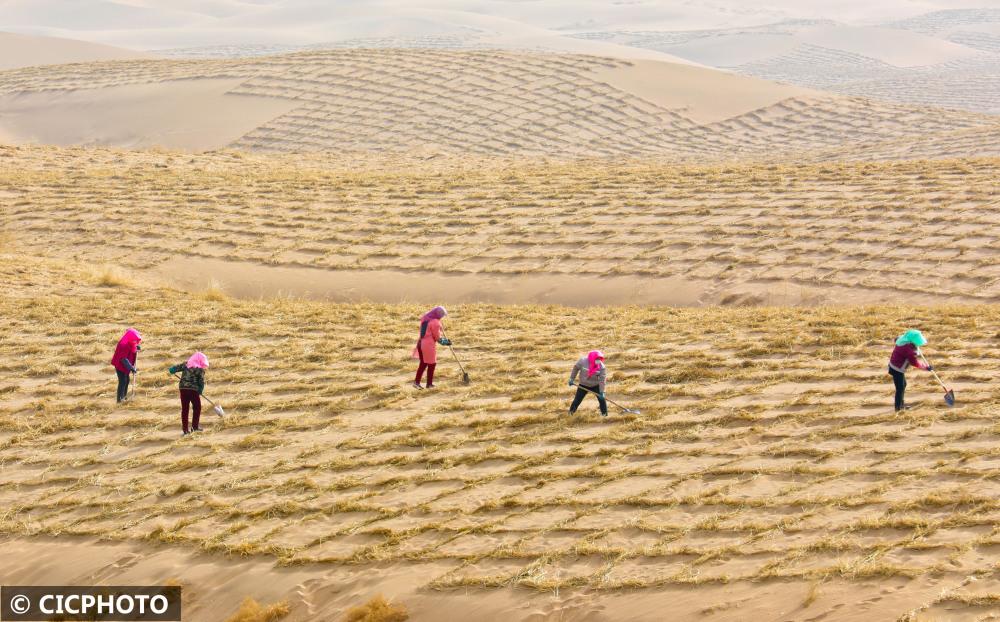 ↑2022年3月11日,甘肃省张掖市临泽县北部干旱荒漠区沙漠上,人们在用麦草压沙障。CICPHOTO/王将 摄