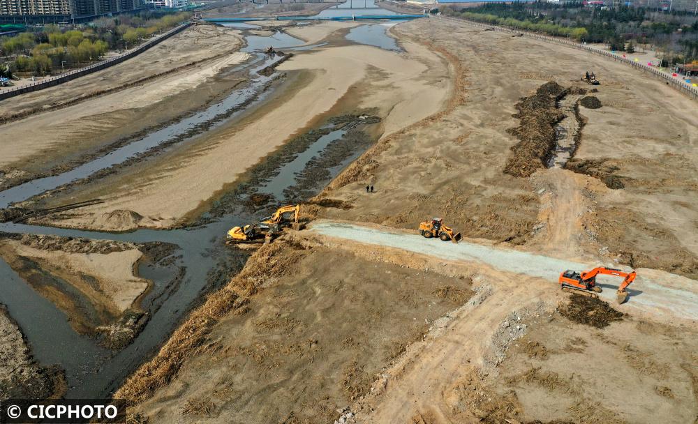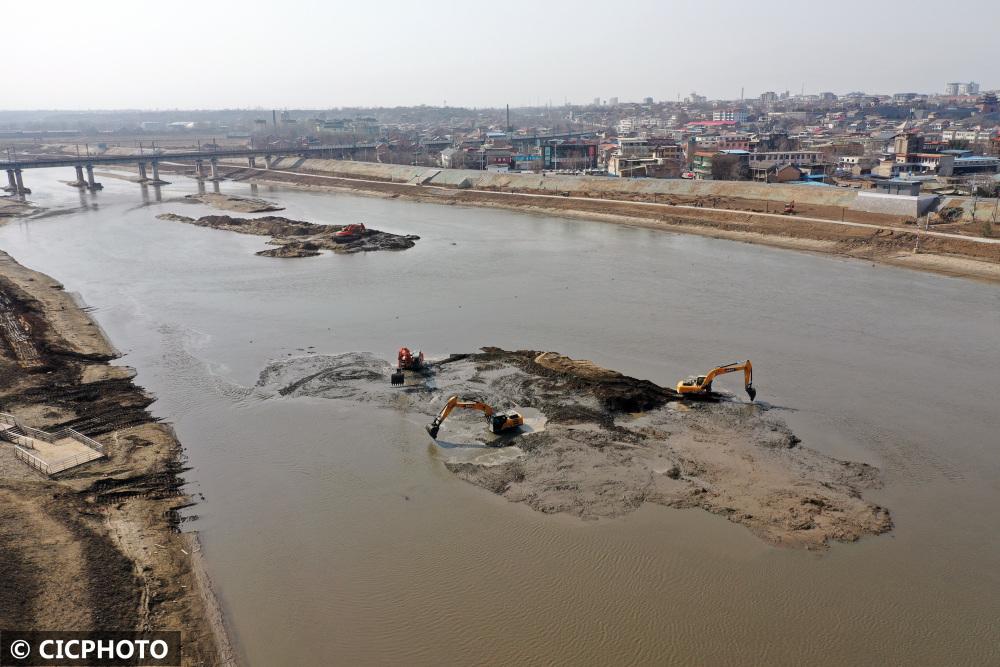 ↑2022年3月9日,山西省临汾市襄汾县滨河公园内,施工人员驾驶大型机械对流经城区的汾河河道进行疏浚清淤作业。(无人机照片)CICPHOTO/李现俊 摄