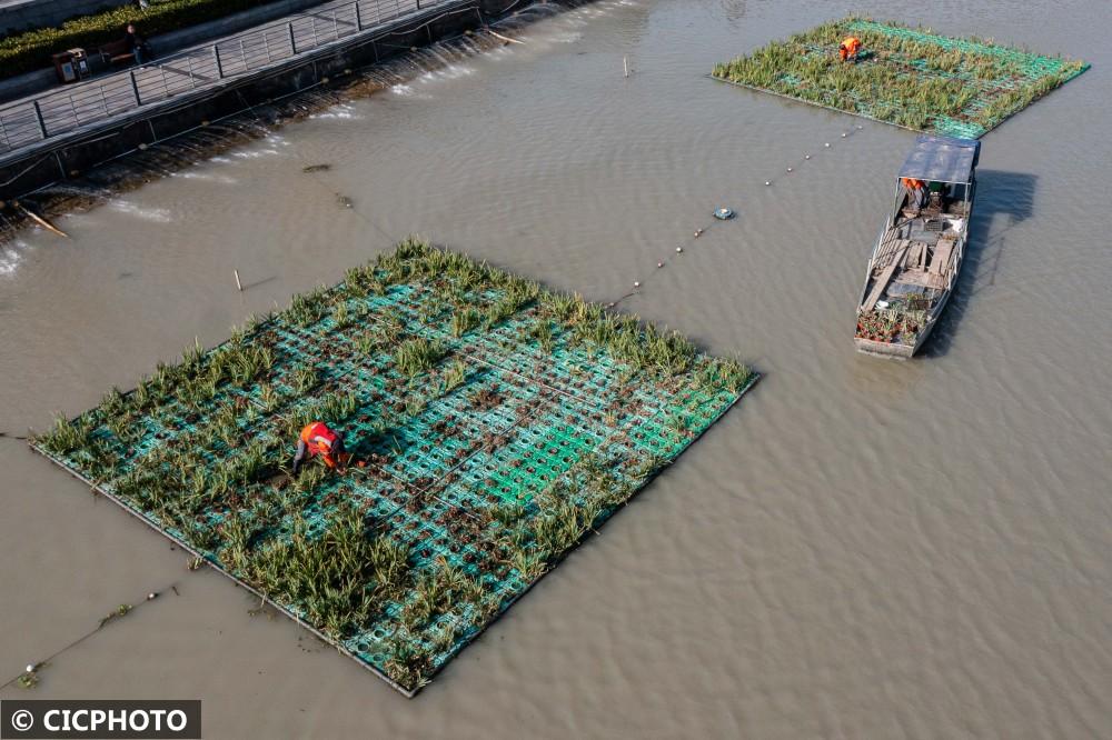 ↑2022年3月8日,养护工人在浙江省湖州市吴兴区环城河“生态浮岛”水域补栽绿植。(无人机照片)CICPHOTO/伊凡 摄