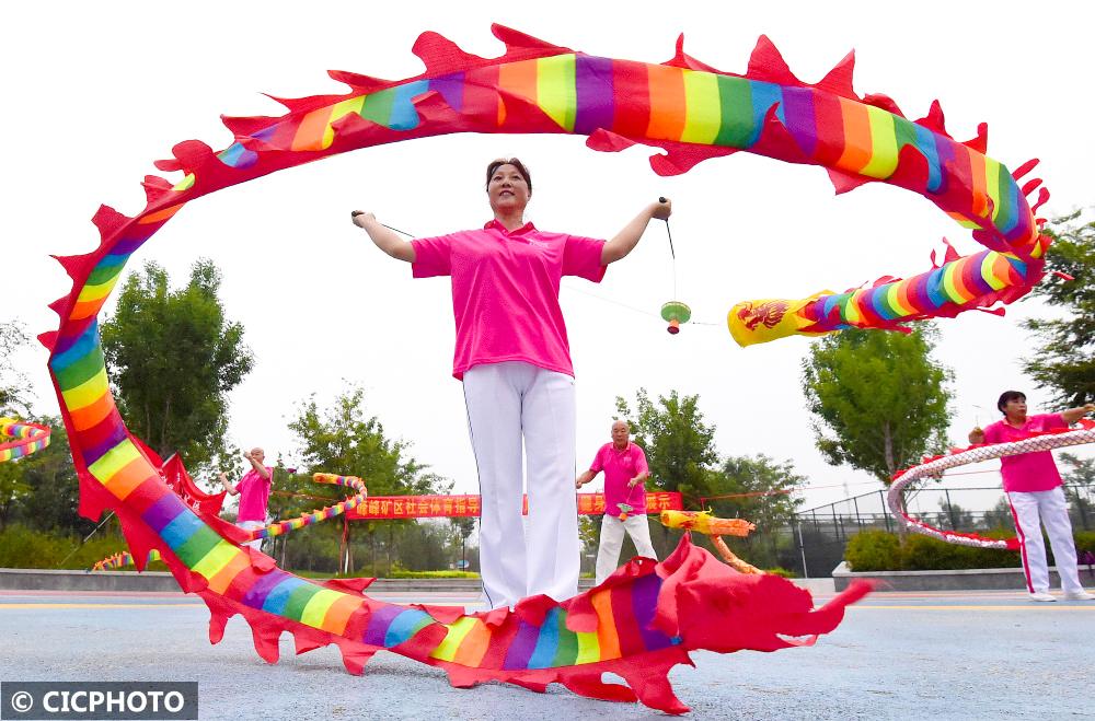 ↑2022年8月7日,市民在山东省枣庄市光明路街道西沙河公园里舞“彩带龙”。CICPHOTO/吉喆 摄