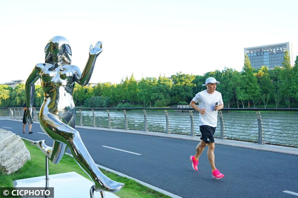 ↑2022年8月8日,浙江省嘉兴市南湖区凌公塘文化主题公园,市民在晨晖中跑步锻炼。CICPHOTO/金鹏 摄