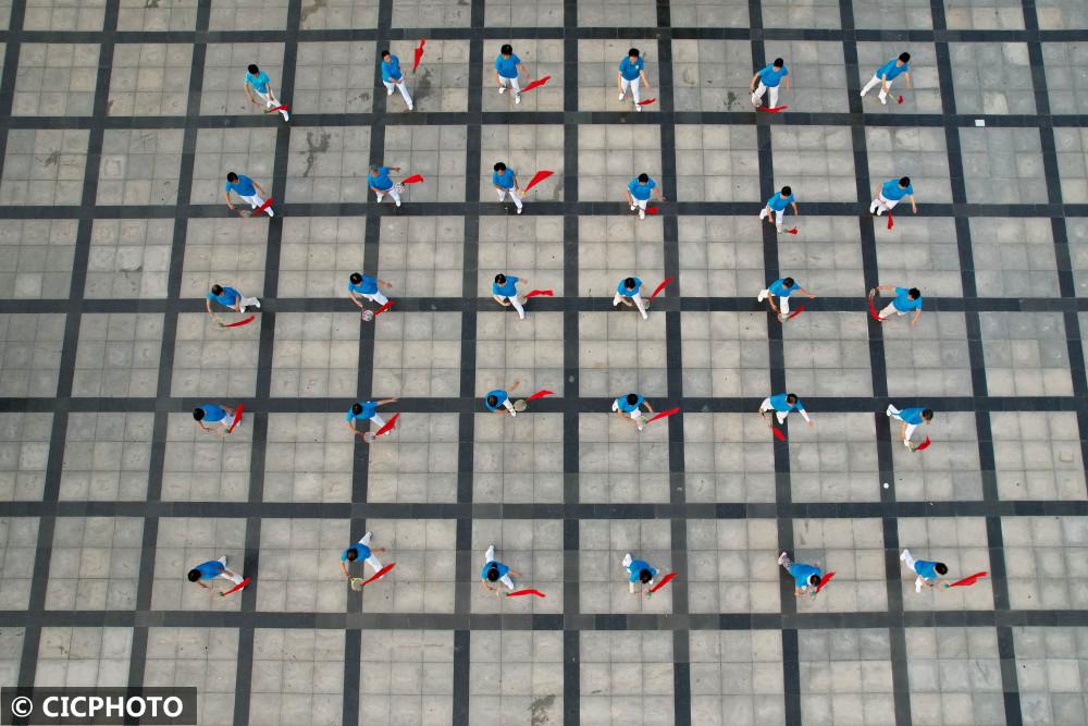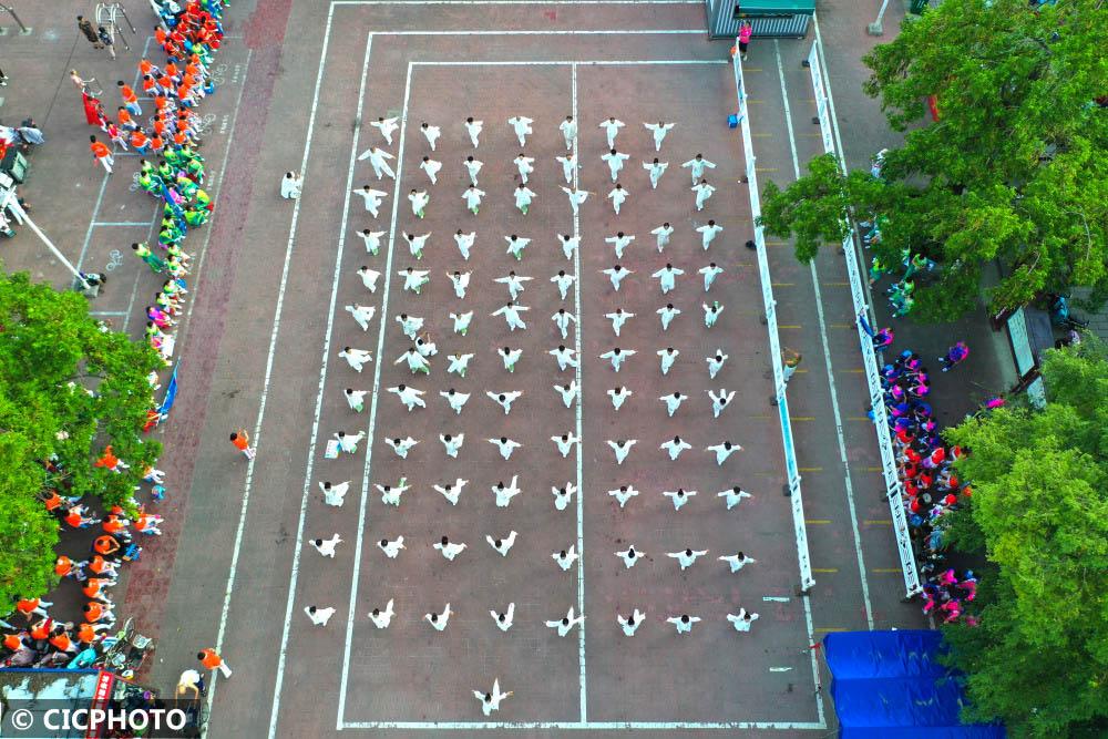 ↑2022年8月7日,安徽省蒙城县历史文化广场,市民在展示健身气功五禽戏。(无人机照片)CICPHOTO/胡卫国 摄