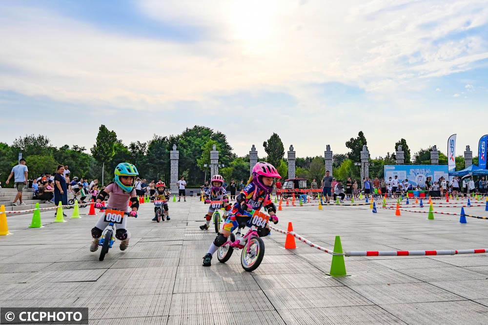 ↑2022年8月7日,山东省潍坊市青州市,小朋友们在参加儿童平衡车比赛。CICPHOTO/王继林 摄