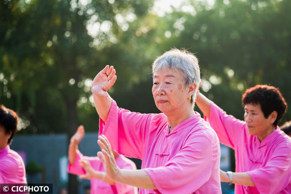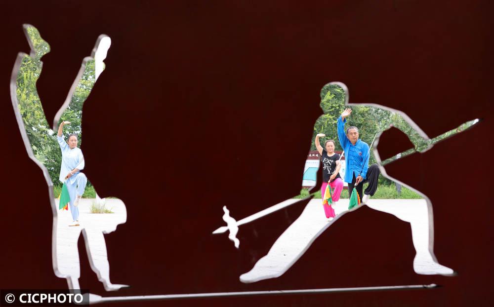 ↑2022年8月6日,市民在河北省邢台市柏乡县中兴公园里练习太极拳。CICPHOTO/栗剑兵 摄