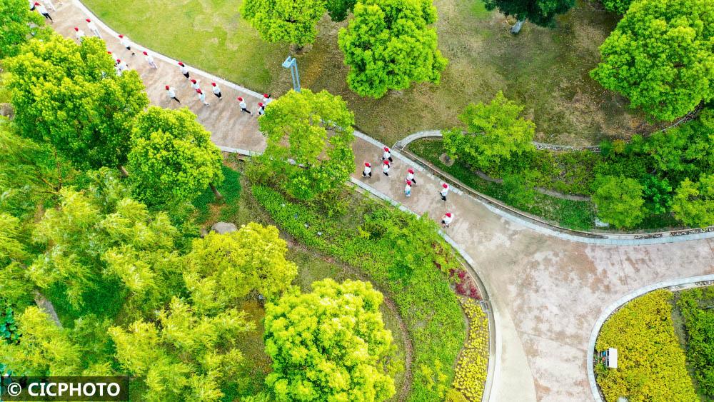 ↑2022年8月6日,市民在江苏省如皋市龙游河生态公园里跑步。(无人机照片)CICPHOTO/徐慧 摄