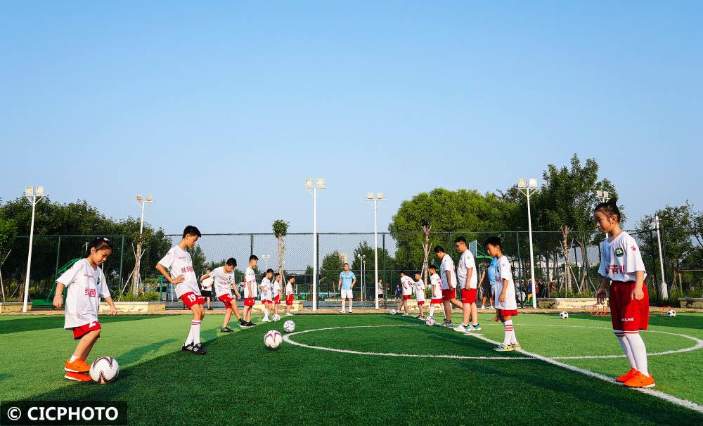 ↑2022年8月6日,河北省邯郸市磁县如意湖公园足球场,小朋友们在进行足球训练。CICPHOTO/赵飞飞 摄