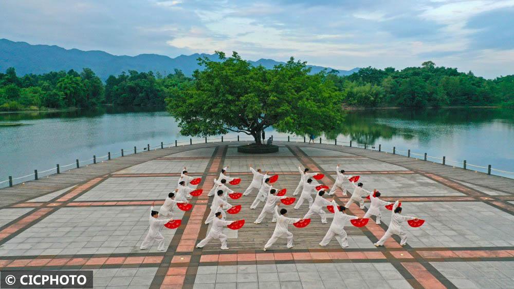 ↑2022年8月6日,重庆市梁平区双桂湖国家湿地公园,市民在练习太极功夫扇。(无人机照片)CICPHOTO/刘辉 摄