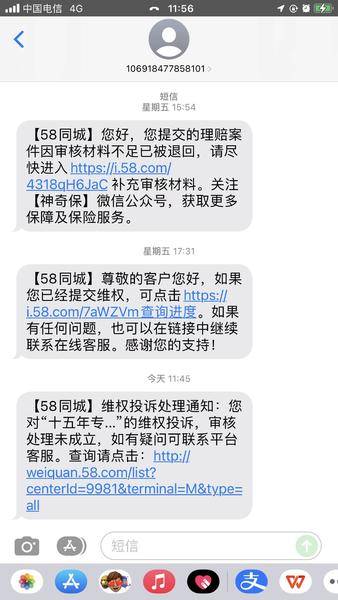 刘女士说,7月13日,她向“58同城”提起投诉,平台称会尽快处理,但始终没有结果,且多次判定她的投诉不成立。7月28日,“58同城”工作人员联系到她,称愿意赔偿300元,她拒绝。随后,收到了“58同城”的短信,称她的投诉单“未成立”,“那是第四次了,我很快就又提交了第5次,但之后再没有回复。”