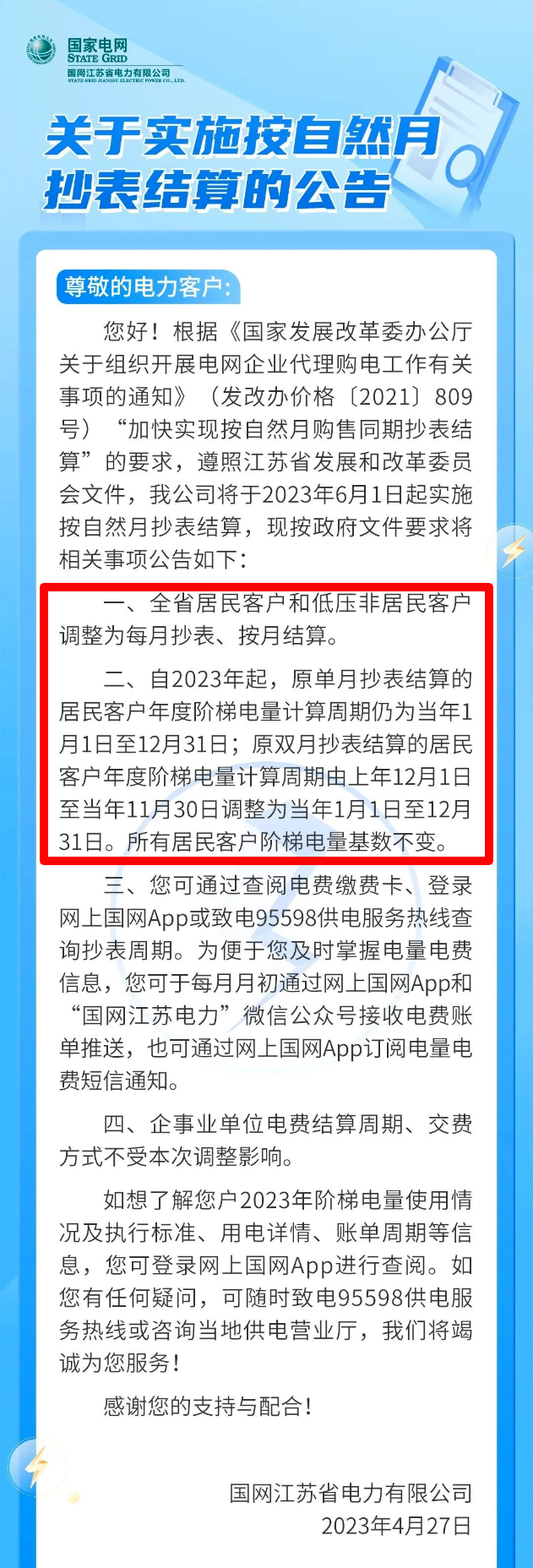 二、自2023年起,原单月抄表结算的居民客户年度阶梯电量计算周期仍为当年1月1日至12月31日;原双月抄表结算的居民客户年度阶梯电量计算周期由上年12月1日至当年11月30日调整为当年1月1日至12月31日 。所有居民客户阶梯电量基数不变。