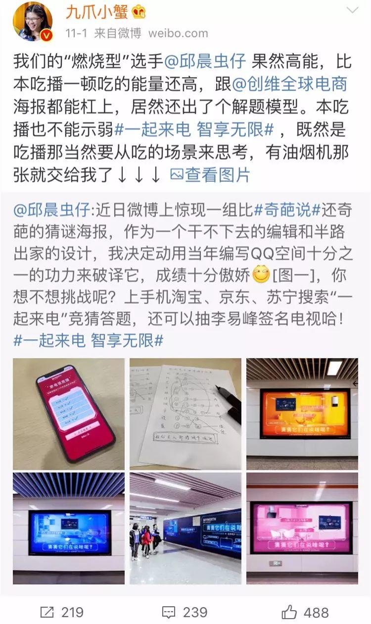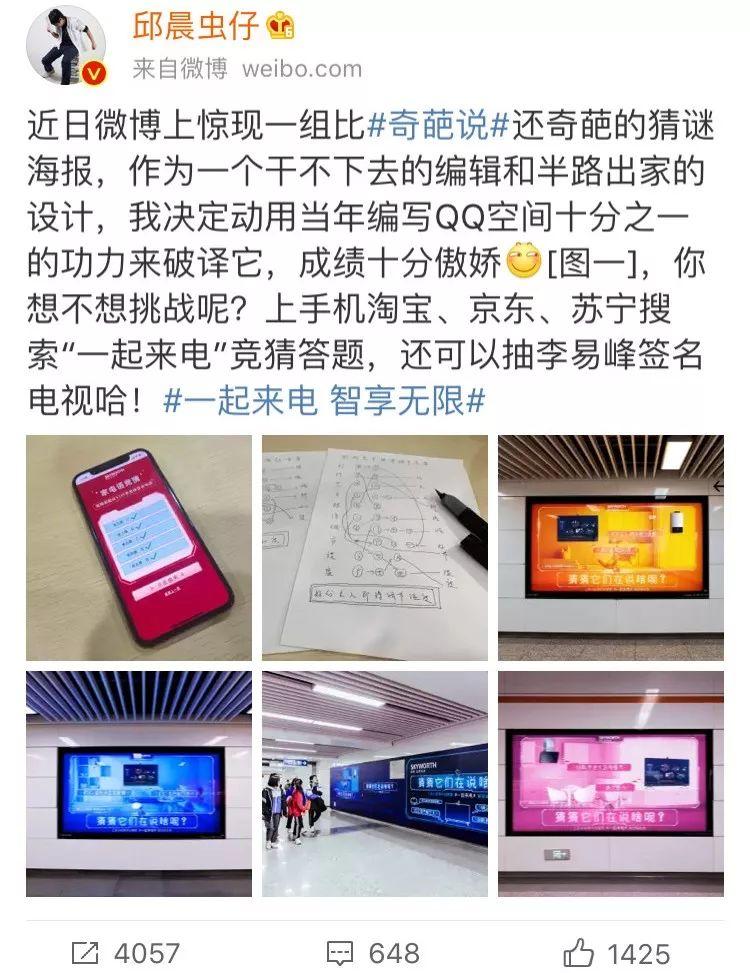 其次,引发大众热议,刨根问底让粉丝主动猜测创维电视“家电语”海报到底在说什么。这期间还成功的引起了奇葩说辩手邱晨、庞颖的注意,两人更是抛出了自己的解密模型,并在微博上与粉丝互动。