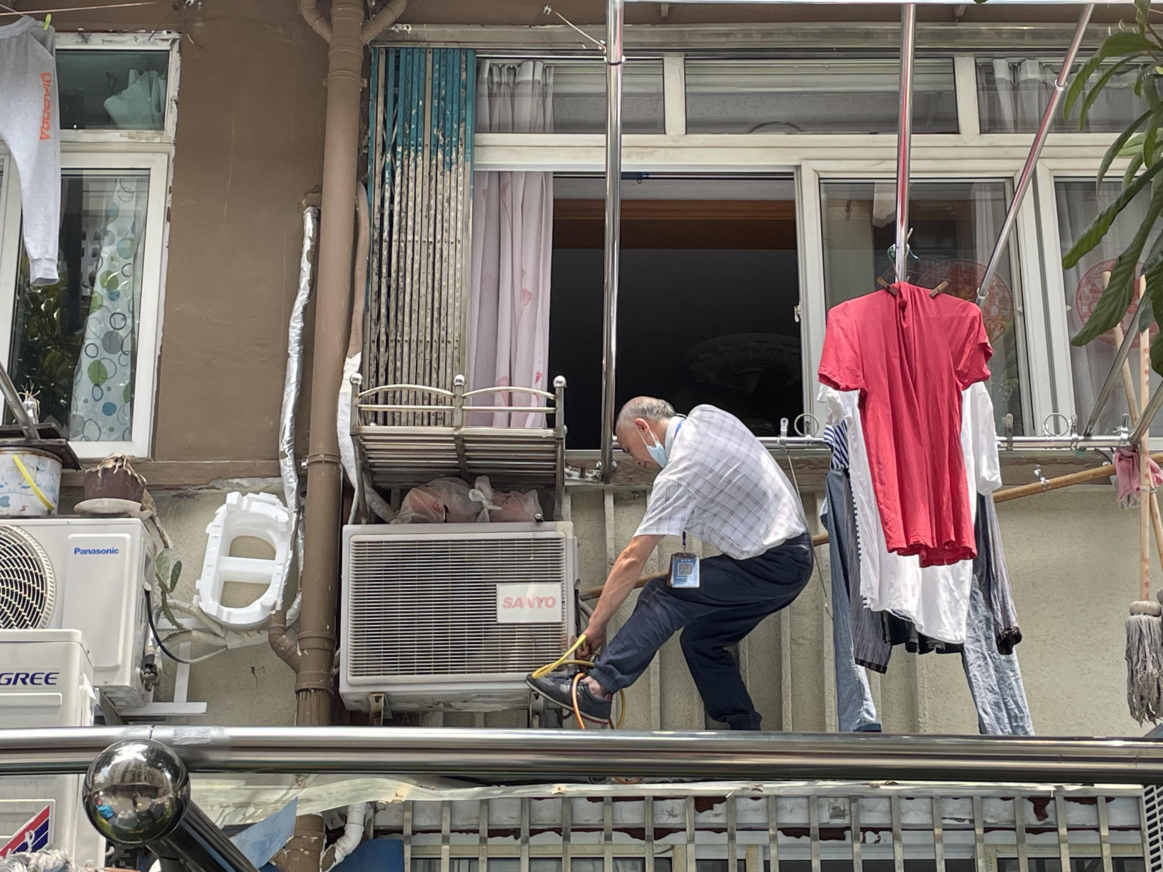 到达用户家后,官师傅顾不上喘口气,马上爬到凳子上开始工作。经过一番测试,官新塘决定从阳台爬出去,检查空调外机。他坦言,修空调在所有维修项目中属于比较吃力的一种。一是不能拿到店里去修,每次都要上门服务。二是大部分故障都在空调外机处,每次都要爬到户外去检查,既繁琐又危险。加之在高温天里作业,难度系数就更高了。