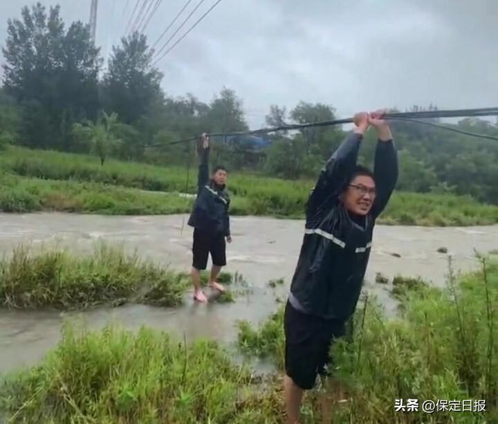 7月30日,易县紫荆关镇遭受暴雨袭击,横跨拒马河长达240米的六条光缆线路低垂于河道中央,为了避免后期发生重大故障,易县分公司组织抢修团队及时赶到现场进行抢修。易县分公司网络部主任李鹏飞一行冒着大雨,不顾冲走的鞋子,赤脚淌进深达50厘米的积水,用身体当做支架,奋力扛起通信“生命线”,即使跌倒了,也来不及休整,立马爬起来继续抢修作业。经过两个时间的奋力抢修,终于将低垂于河水中的光缆架高并拽上了岸,抢修队员们却来不及吃一口饭,又紧急赶往了下一个抢修点。