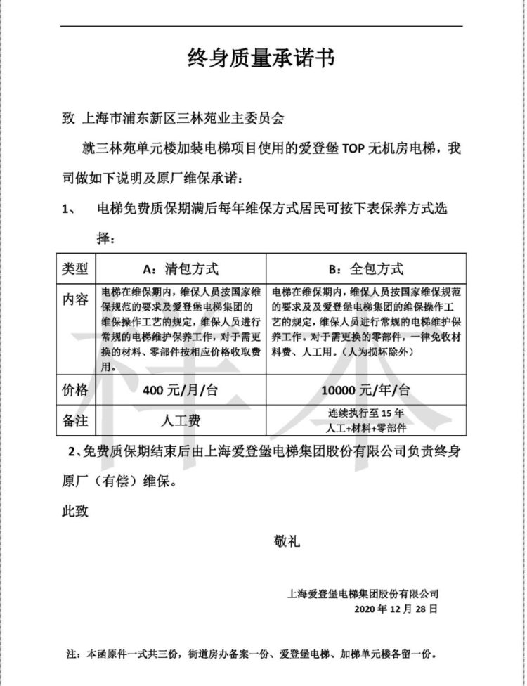“在我们全包维保15年的过程中,所有部件(除人为损坏外)的维修和更换均由制造单位负责免费完成。”上海爱登堡电梯集团股份有限公司代表谭建明表示,签定这一终身电梯质量承诺,能促进公司加强电梯的日常维修保养质量,减少电梯故障,同时,因为是全包,一旦遇到问题就会及时解决。