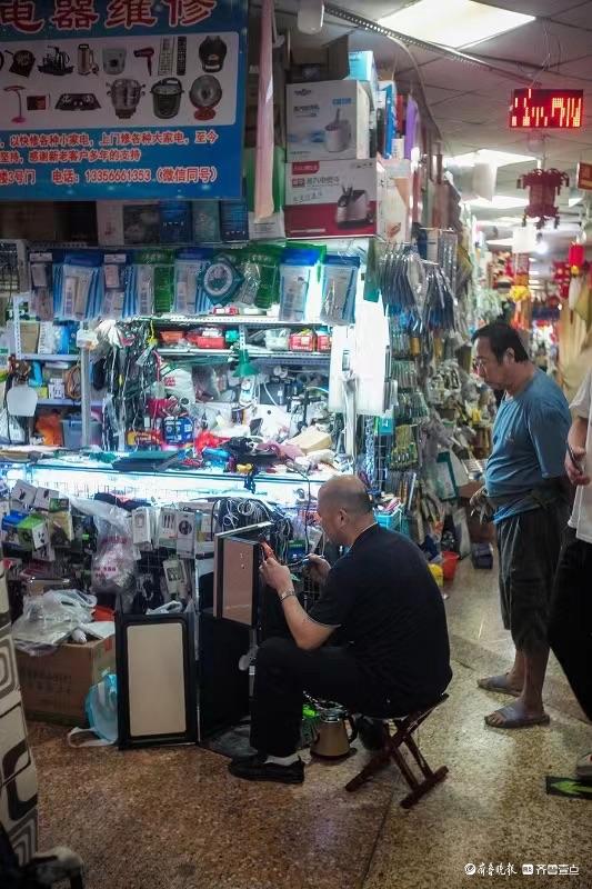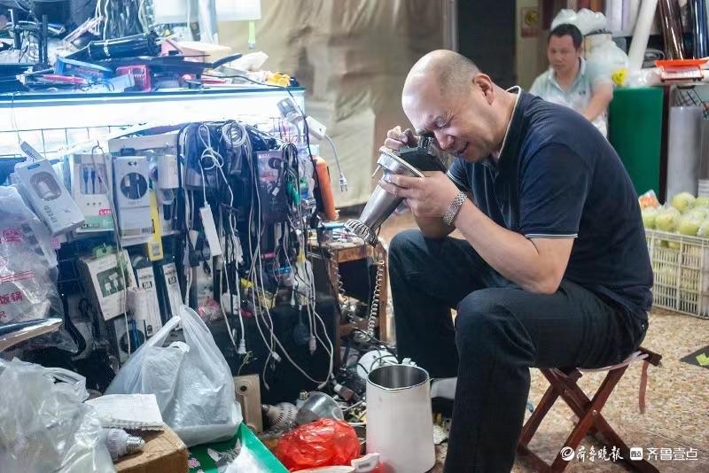 9月1日,在济南新世界商城老岳电器维修店,老岳正在为客户修理电器。老岳名叫岳喜亮,干电器维修已有38年。 王剑 摄