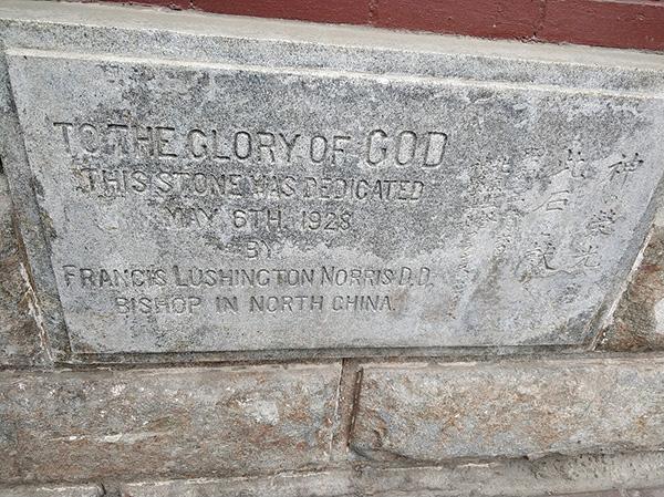 我望着塔尖寻觅过去,由于不是宗教活动时间,教堂里面并不开放,但有工作人员在院里,允许我进入院内拍摄教堂外观。我在教堂外墙下侧发现一块白色石头,上面用英文和日文写着“此石献给神的荣光”,英文日期是1928年,日文日期是昭和三年。