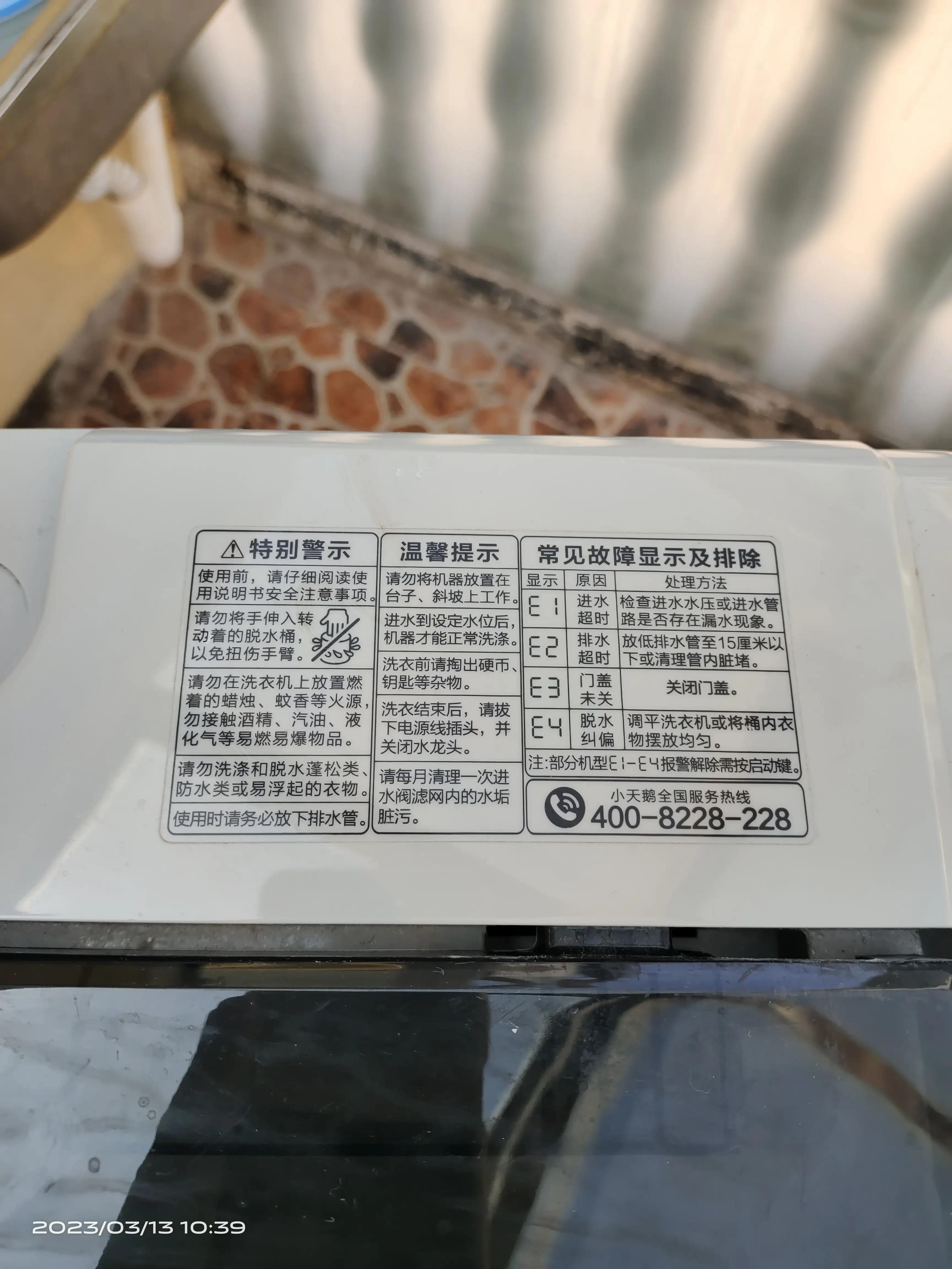 此为小天鹅全自动洗衣机故障代码。前几天为用户检修一台小天鹅全自动洗衣机,故障现象是不排水。上门检查后发现排水电磁阀能打开,但排水速度很慢。查看排水口有布状物质,清理堵塞物后不排水故障解决,但洗涤时水住达到一定压力出现故障代码E3,根据故障代码判定为门盖未关好造成的,经检测为安全开关未到位。调整好安全开关后故障排除!由此例故障体会是维修时不能完全依赖故障代码,代码只不过给维修人员提供一条检修思路,维修人员要运用检测仪表对故障元件进行数据检测,通过检测数据判定故障所在最终排除故障。
