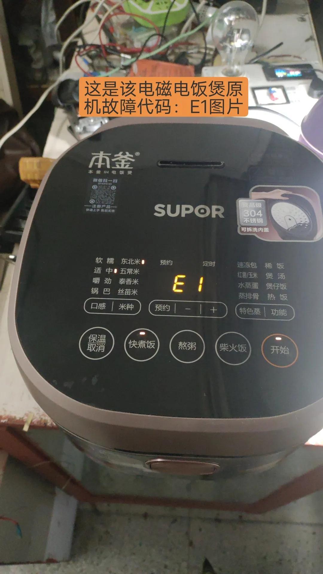 此为苏泊尔智能电磁电饭煲在开机的1~2秒内显示正常,之后显示故障代码E1,代码含义为上盖温度传感器开路。更换上盖传感器无效,最后更换主控板后故障排除。