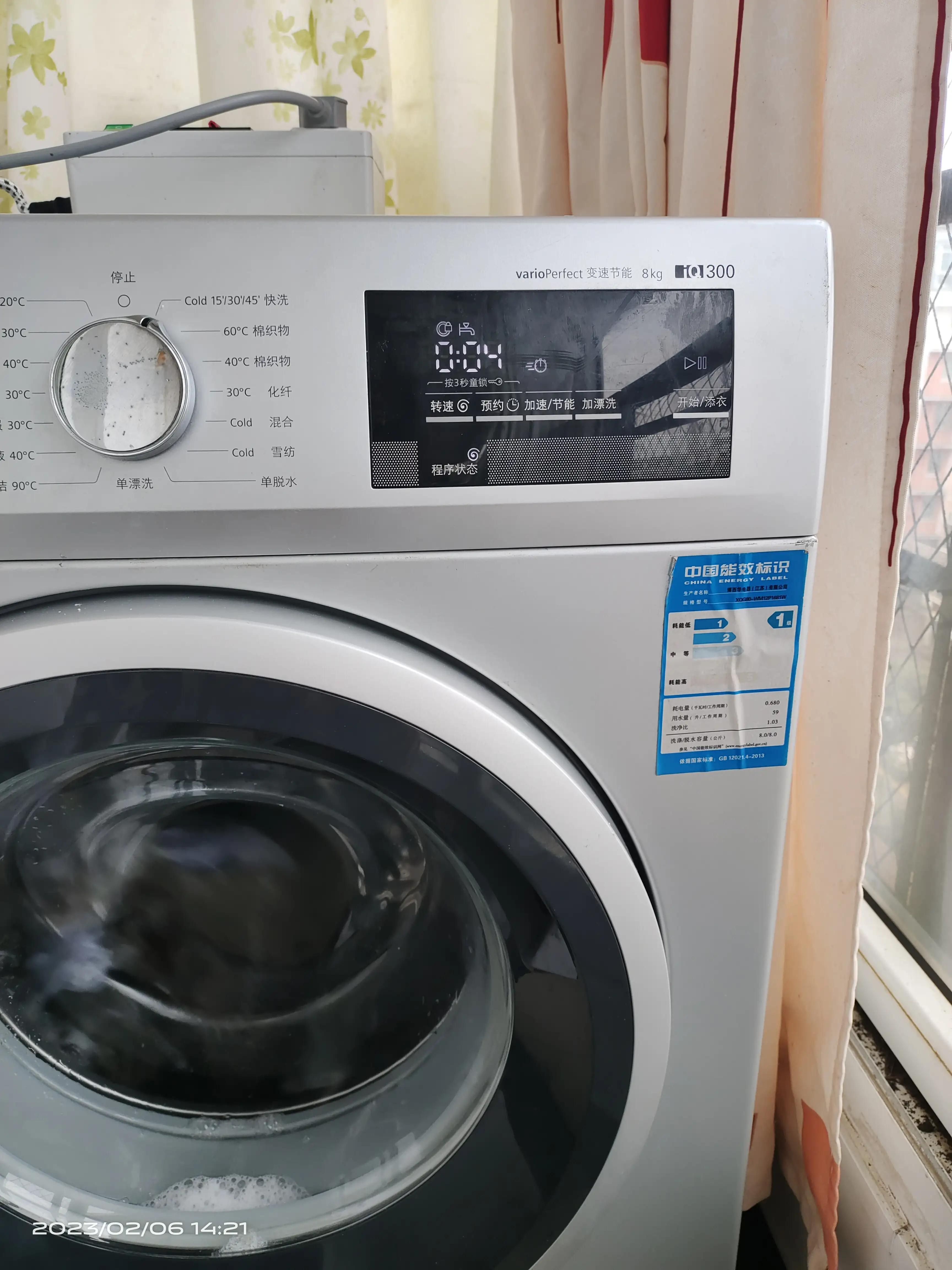 此为修复后正常工作的西门子滚筒洗衣机,显示屏进水符号、上锁符号等各种功能符号清晰显示在显示屏上。看到这些正常符号表明洗衣机进入正常洗涤程序状态。