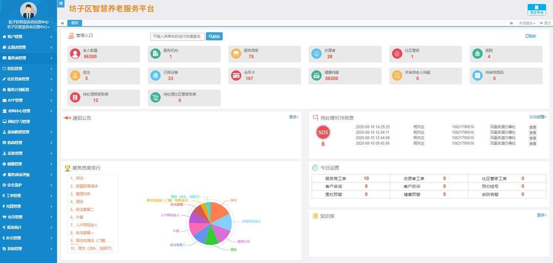 建成“1个智慧中心”,织密养老服务一张网。采取系统集成的办法,建成区级智慧养老服务中心,构建起“1平台+2体系+1网站”的“121”智慧养老服务体系。1平台,即坊子区智慧养老服务平台。2体系,即监管和服务两大体系。监管体系包含政府监管和运营管理两部分,服务体系包含用户、机构、医护、呼叫、义工和服务商6大中心。1网站,即坊子区智慧养老服务网站,包含养老政策法规、新闻资讯、通知公告、养老机构、养老地图、在线学习等9大板块,面向全体居民开放,提供机构全景浏览、知识学习、信息查询、网上购物等功能。为充分发挥平台作用,采集更新6.5万名老人信息和养老机构、服务商家和志愿者等信息,纳入平台管理,构建起覆盖全区的养老服务网络。