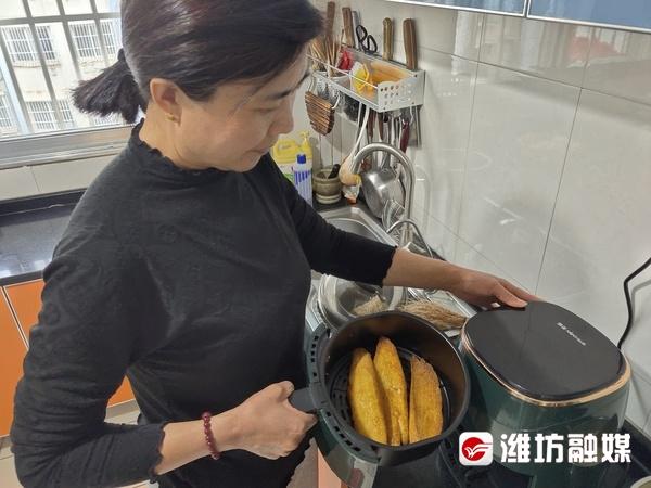 家住坊子区欧美佳苑的王女士用空气炸锅烤面包片。