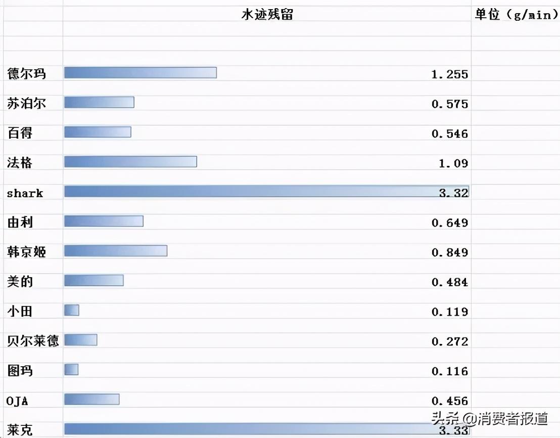 Shark和莱克样品的水迹残留较多,超过3.3g/min。