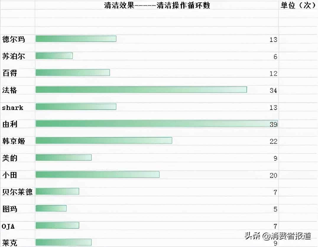 在本次比较试验中,苏州卡哇云信息科技有限公司(标称)制造的“图玛”牌TCC-1301型多功能蒸汽地拖机和浙江绍兴苏泊尔生活电器有限公司(标称)制造的“苏泊尔”牌SCT23A-15型蒸汽拖把样品,分别用了5次和6次循环便达到清洁效果;法格和由利样品达到清洁效果分别需要34次和39次循环。