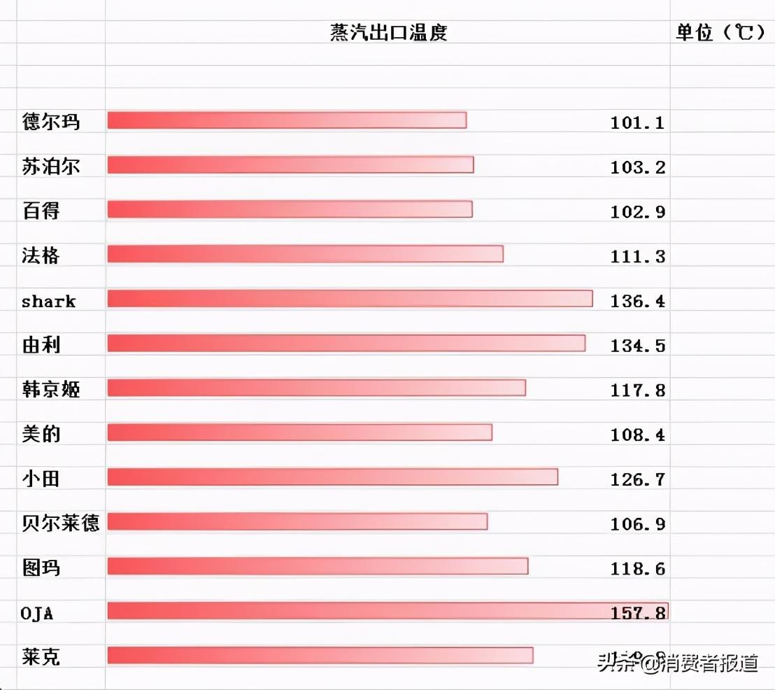 其中深圳天购商贸有限公司(标称)制造的“OJA”牌蒸汽拖把,蒸汽出口温度最高,达157.8℃。