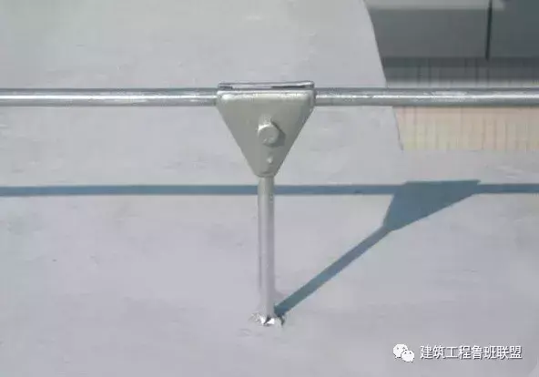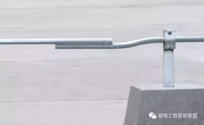 (1)支撑点与避雷网不用焊接方式,用比镀锌圆钢略大一点的套管制作卡具,镀锌后安装在女儿墙上。既让镀锌圆钢穿过去减少了焊点,保护镀锌层,增加使用寿命,也可让避雷网自由伸缩。