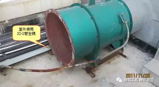 通病10露天或潮湿场所,电气保护管采用JDG、KBG明配而导致腐蚀