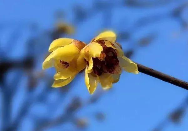 腊梅: 冬天开,黄色,香味浓,花瓣硬硬“蜡”质感。