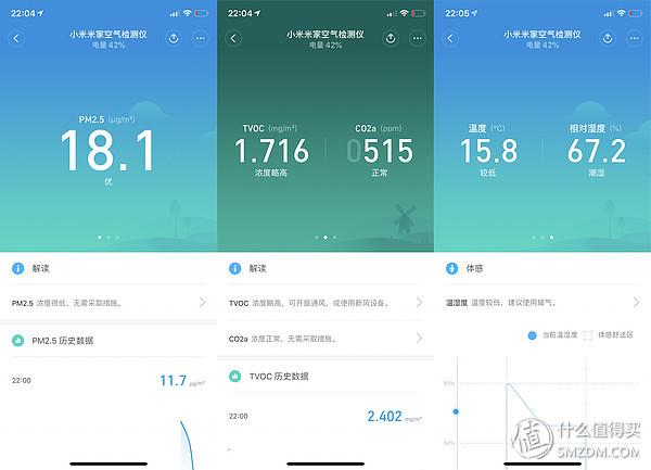 我比较推荐这个界面,可以同时看到温度和湿度,以及pm2.5数值、tvoc以及二氧化碳浓度。
