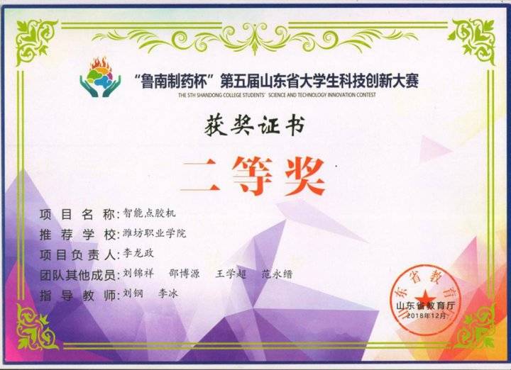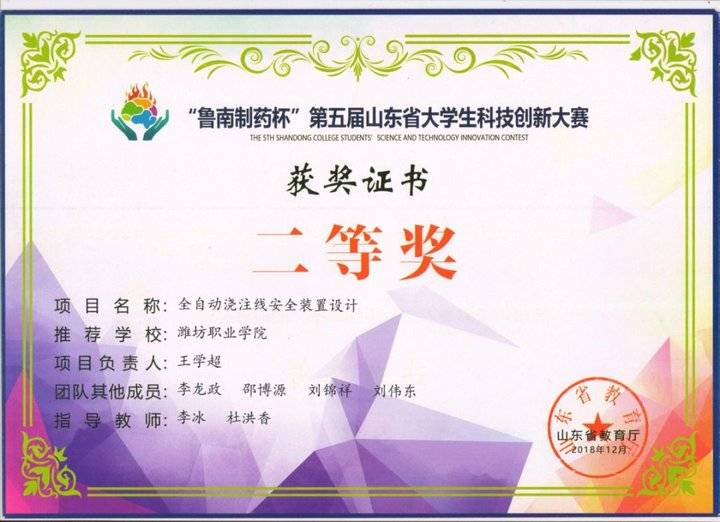 学生参加2018年山东省大学生科技创新大赛,获二等奖1项、三等奖1项