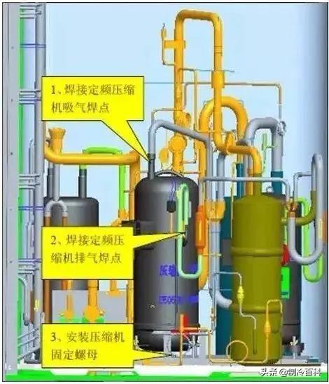 (2)、焊接完成管路系统后,需要使用垫脚和螺栓固定压缩机,保证压缩机运行时的稳定性。