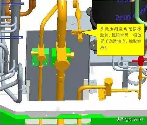 1、连接机组大小阀门,抽真空30min以上。使用橡胶管连接低压测量阀,打开盛放润滑油的容器,将润滑油倒入量杯中量取合适的追加量。追加合适的润滑油后,关闭低压测量阀,保证密封。
