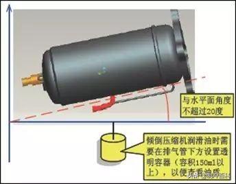 在搬运新压缩机时,都需要注意压缩机不能平放或者倒置,倾斜角度应保持在±30°以内,也要注意不能让压缩机内润滑油从油平衡口处流出。