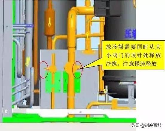 释放系统的制冷剂,应该同时从系统高压侧和低压侧释放制冷剂,如果仅从一侧放气,涡旋盘密封会导致制冷剂释放不完全。释放制冷剂的速度不宜太快,否则会有大量的润滑油被制冷剂一起带出系统。