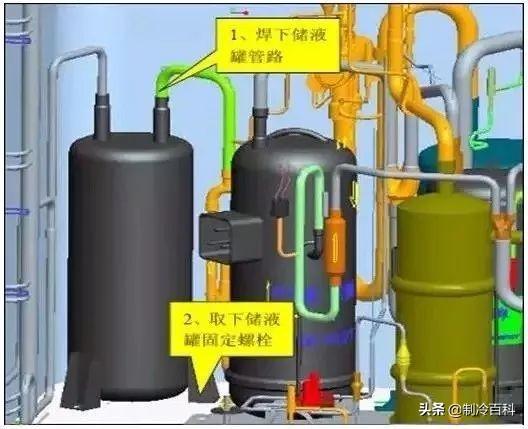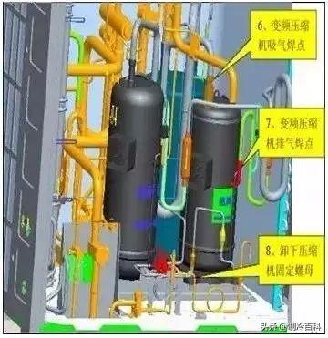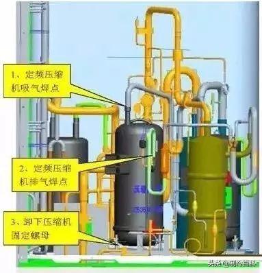 如果变频压缩机损坏,或者是定频压缩机内油质被污染时,需要拆掉变频压缩机,甚至更换油分离器和气液分离器