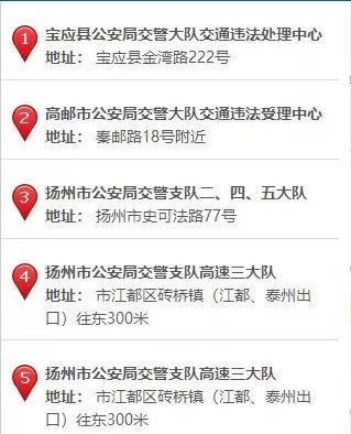 受理网点电话邗江区公安分局交警大队-汊河中队违法处理点0514-80685292仪征大队0514-83421907江都大队0514-86060948高邮大队0514-84066586宝应大队0514-88877271文昌东路违法处理点0514-82087015临江路违法处理点0514-82189937荷叶东路违法处理点0514-80689697运河西路违法处理点0514-80689178车管所