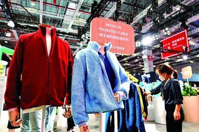 第五届进博会上,工作人员在整理环保服装,该服装面料采用源自回收塑料瓶的再生聚酯纤维。新华社发