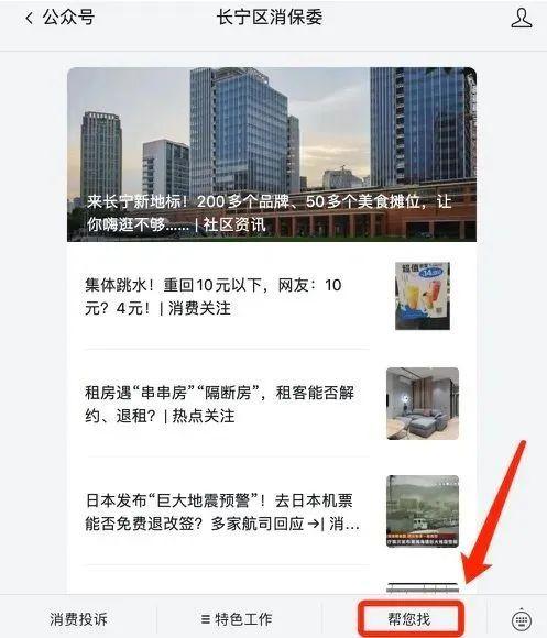 1、关注“长宁区消保委”的微信公众号,内设“帮您找”栏目。