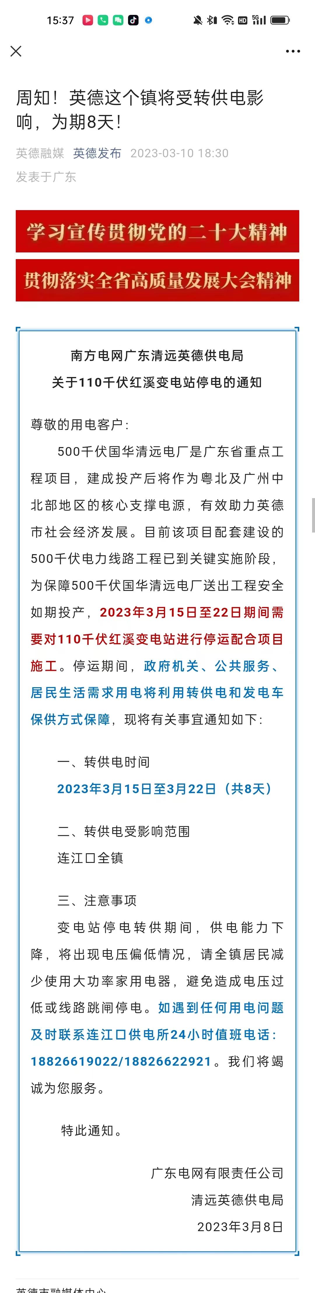 广东英德这个镇将受转供电影响,为期8天!减少使用大功率家用电器!