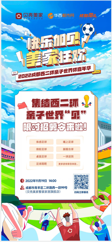 11月19日14:00,一场元气超燃的“世界杯亲子狂欢”将在成都青羊区西二环(贝壳美家整装家居旗舰店)举行。届时,活动现场将有神秘的足球大咖、特制的赛事奖牌、丰富的足球体验……等着你!这场“世界杯亲子狂欢”便是由贝壳美家、华西都市网、成都范儿主办的“快乐加贝·美家狂欢”——2022成都西二环亲子世界杯嘉年华。日前,活动的报名通道已正式开启,欢迎各位家长朋友带上自己的宝贝踊跃报名。