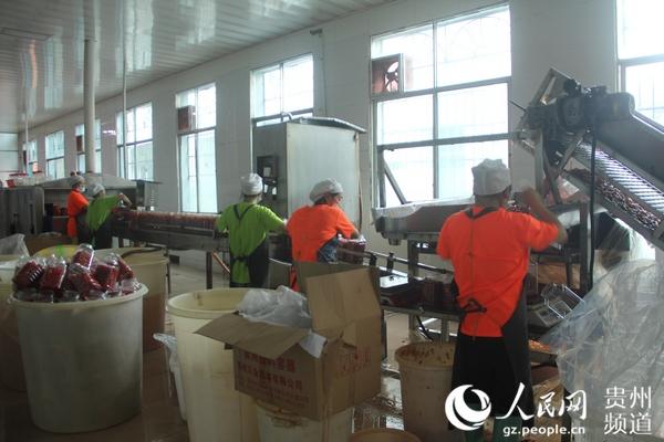 近日,笔者来到瓮安县冬秀孃酸辣食品有限公司,一进厂区大门,就被眼前的鲜椒收购场面震撼了。只见1000多平米的仓库空地上,红椒堆成了一摞摞红色的小山坡,50多个工人十几人一组,围坐在一堆堆“椒山”旁,动作敏捷地给辣椒脱“把儿”。不远处的泡椒搅拌车间、包装车间机声轰隆,戴着口罩的工人挥动铁铲,不停歇地将已经脱“把儿”的红椒铲到传输带上。由于生产过程中鲜椒被捣碎搅拌,空气中弥漫着一股浓烈的辣味,呛得人眼泪直流。