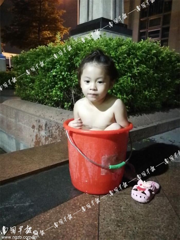 6月12日晚11时,长堽路盛天果岭小区,居民从小区楼下市政管道接水给小朋友洗澡。 南国早报记者 李俭芹摄